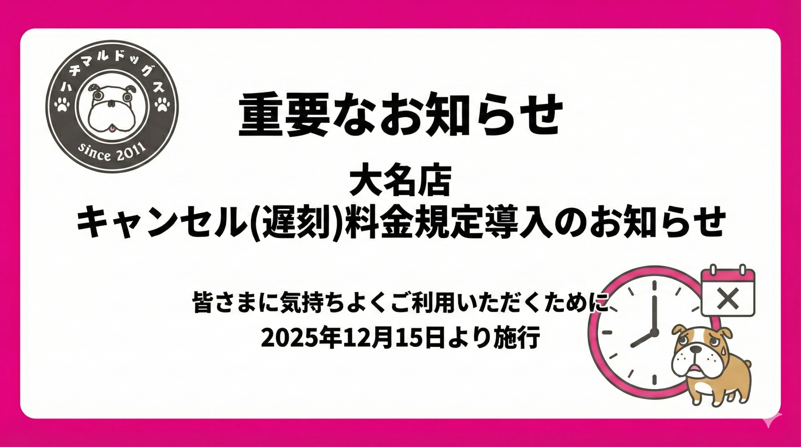 いつもハチマルドッグス大名店をご利用いただき、誠にありがとうございます。 これまで当店ではキャンセル料等を頂戴しておりませんでしたが、無断キャンセルや直前の変更により、 他のお客様のご予約をお断りせざるを得ない状況や、