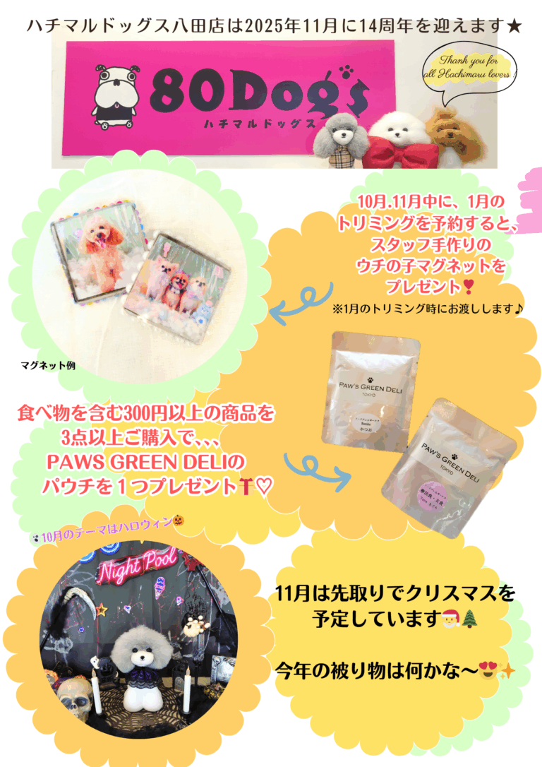 いつもハチマルドッグス八田店をご愛顧いただき、誠にありがとうございます! 皆さまの暖かい応援のおかげで、2025年11月に14周年を迎えます そこで、今年もささやかではありますが、みなさまに楽しんでいただけるようなキャン